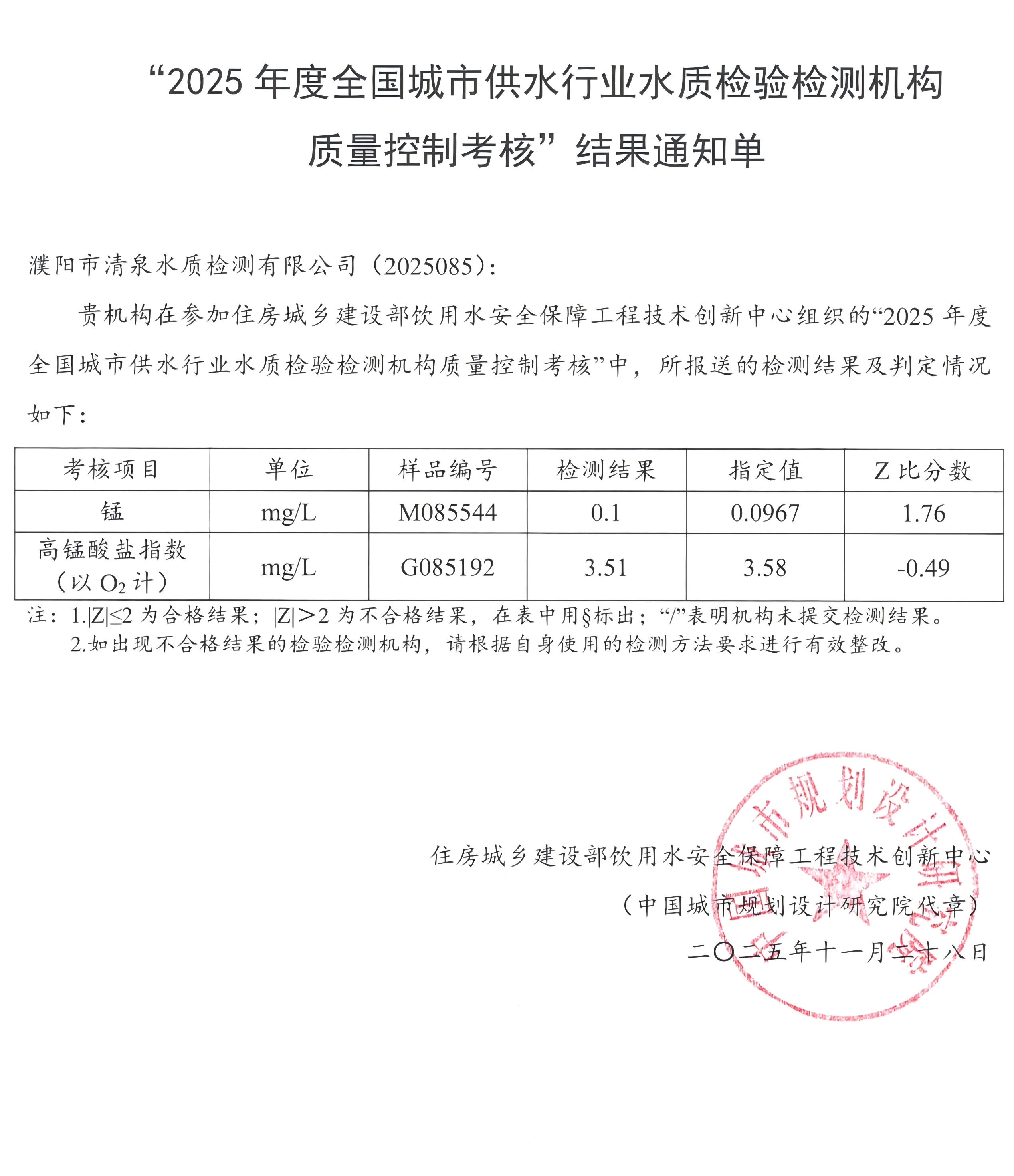 近日,在“2025年度全国城市供水行业水质检验检测机构质量控制考核”中,河南省供水监测网濮阳监测站(水质监测中心)凭借扎实的技术能力和规范的质量管理体系,顺利通过国家级考核。其中,锰和高锰酸盐指数(以O₂计)两项关键指标的检测结果准确可靠,体现了该中心过硬的专业水平。