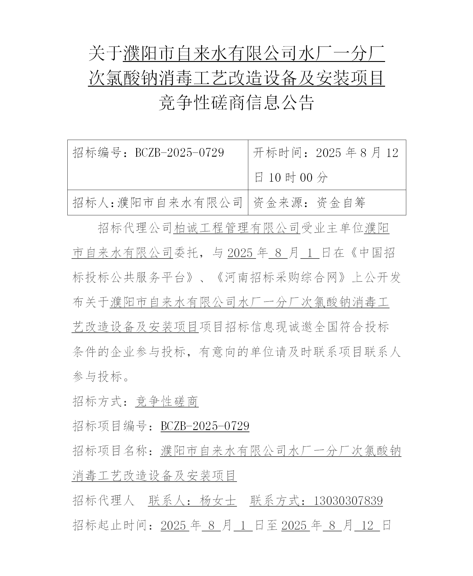 关于濮阳市自来水有限leyu·乐鱼(中国)体育官方网站水厂一分厂次氯酸钠消毒工艺改造设备及安装项目竞争性磋商信息公告