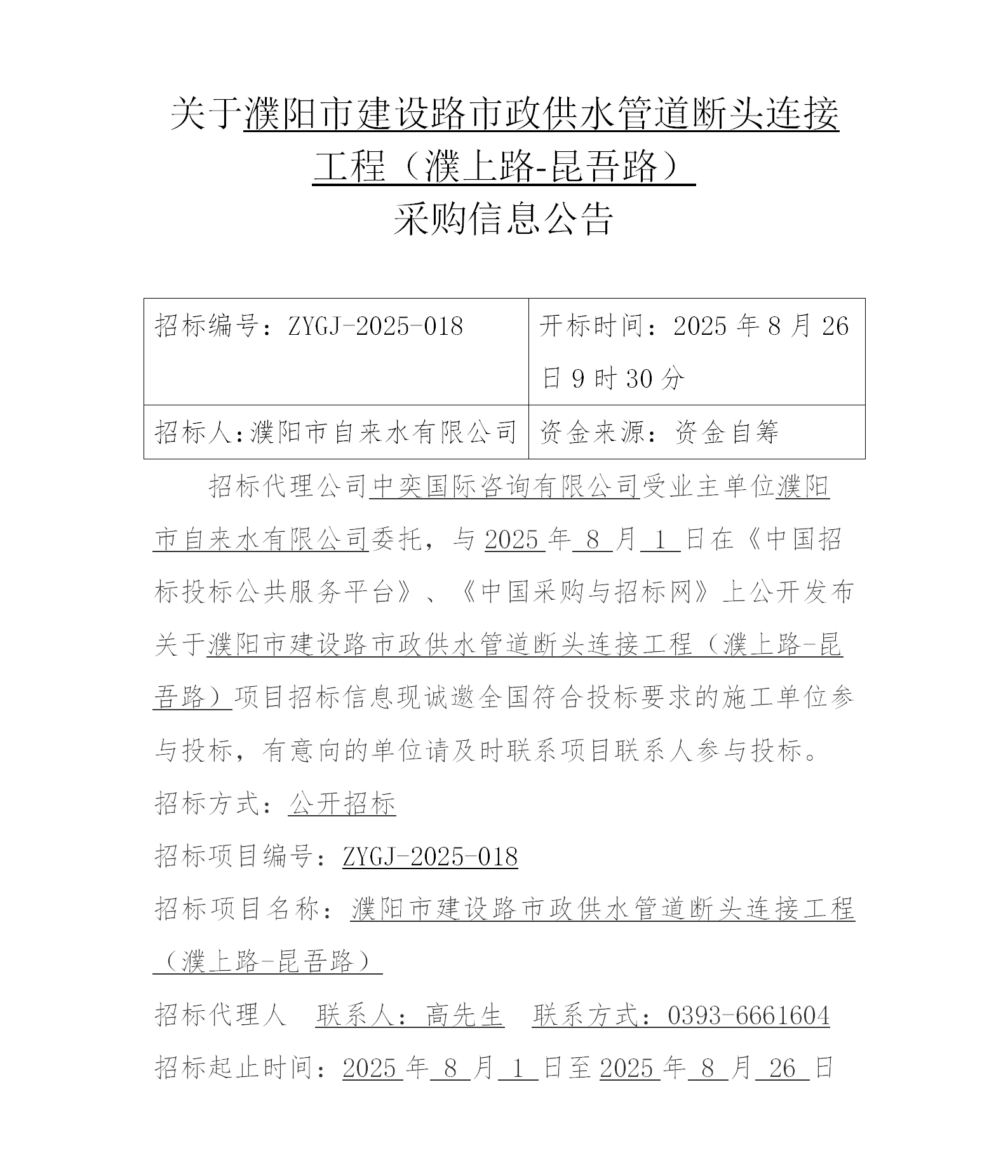 关于濮阳市建设路市政供水管道断头连接工程(濮上路-昆吾路)采购信息公告